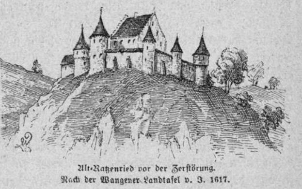 In den Ruinen des ehedem starken und geräumigen Schlosses Ratzenried, dessen Mauerüberreste jetzt noch überaus fest sind, angeblich, weil man bei der Aufführung des Baues den Mörtel mit Wein angemacht habe, war es früher oft nicht ganz richtig, besonders in den Nächten von Allerheiligen und Allerseelen. Man sah da öfters eine mit sechs Schimmeln bespannte Chaise herumfahren, vernahm Hufschläge von Reiterei und Klirren von Rüstungen, und so glaubte man, die alten Ritter würden da erscheinen und Spuk treiben. Wenn das jedes mal eine Zeitlang gedauert hatte, vernahm man darauf in dem nahen Schlossweiher einen mächtigen "Pflumpfer", und alles war dann wieder still. Man glaubte daher, Gefährte und Ritter hätten sich zuletzt jedes mal von der Höhe herab in den Weiher gestürzt.